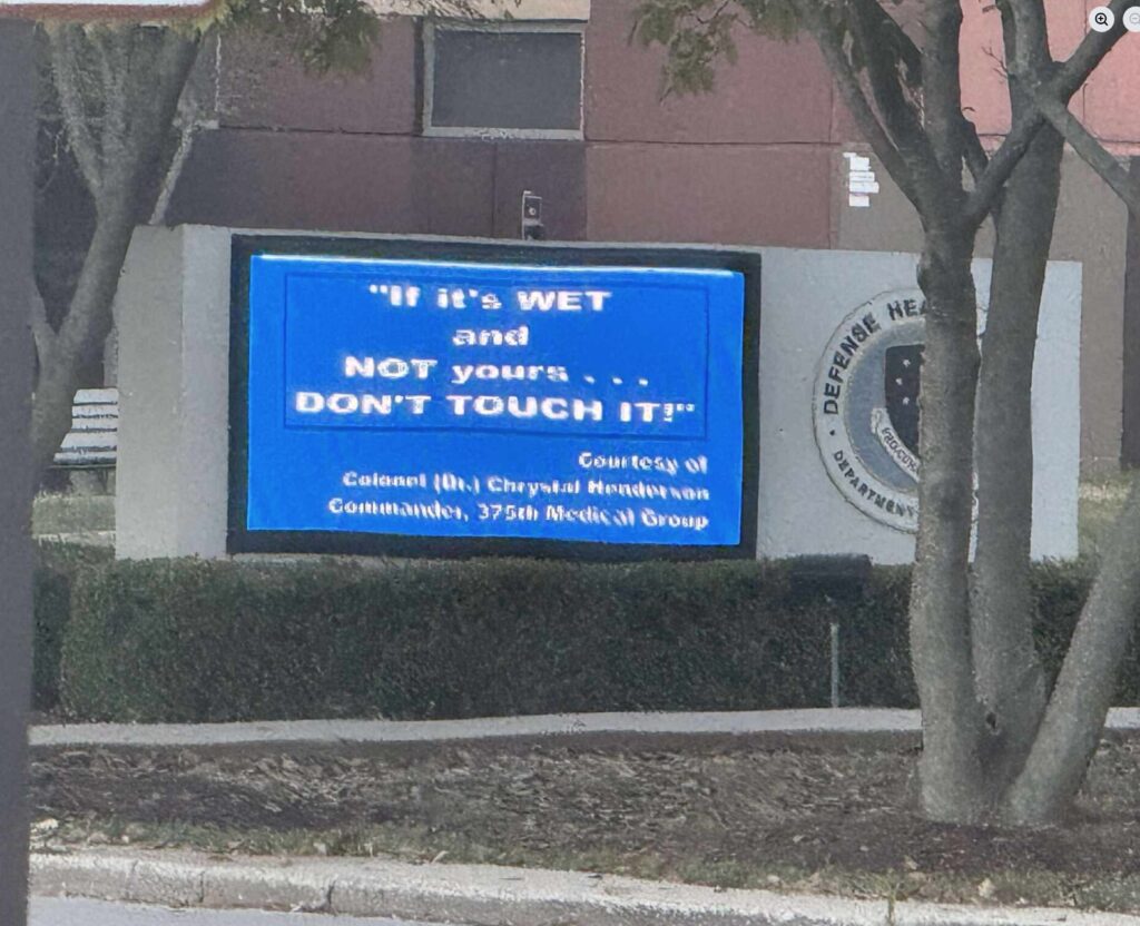 “If It’s WET and NOT yours… Don’t touch it!” Courtesy of Colonel (Dr.) Chrystal Henderson, Commander, 375th Medical Group.