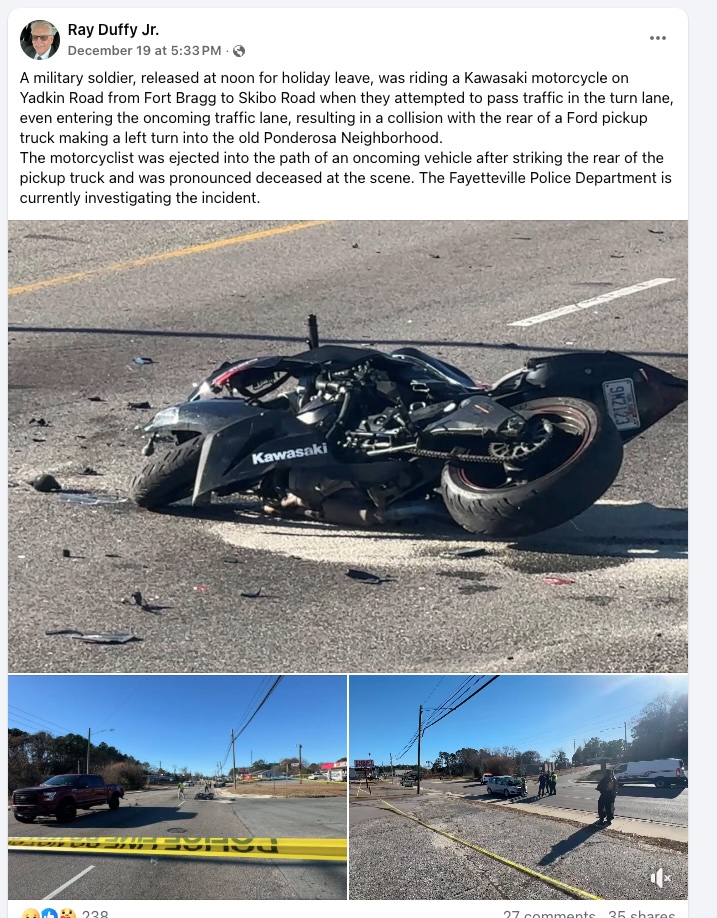 Aguero’s death marks the second fatal motorcycle crash involving a Fort Bragg soldier in less than a month. Four days before Thanksgiving, Jackson “Jack” Corum, 21, assigned to the 1st Brigade Combat Team, 82nd Airborne Division, was killed when his motorcycle crashed at the traffic circle at Person Street and Old Wilmington Road in Fayetteville. The 82nd Airborne Division is one of Fort Bragg’s primary combat units and home to thousands of paratroopers stationed on the installation.